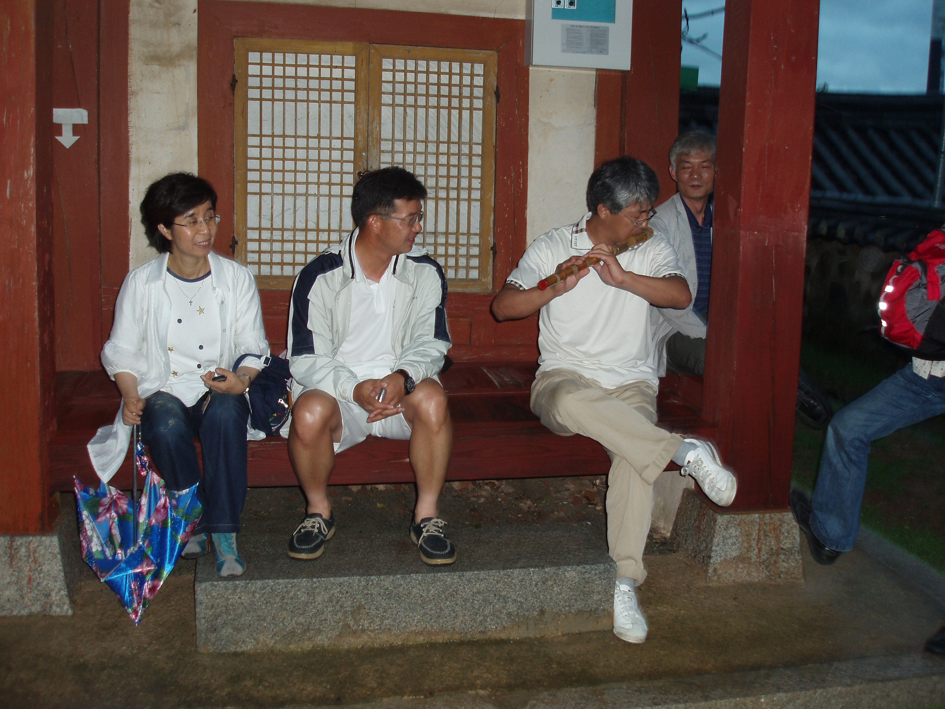 충무공 사당 <충렬사> 마루턱에 앉아 멋지게 대금을 부는 장현근 쌤.하늘에 구멍이 난듯 정신없이 비가 쏟아지는데, 구슬픈 대금소리는 남의 애를 끓나니... 홍원표 쌤의 비감한 표정. 김정호 쌤은 <거참 신기하다>, 박의경 쌤은 <좀 부네>라는 .. 화살표 보이시죠? ^^*